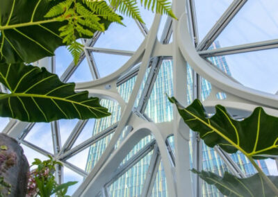 Les Amazon Spheres se distinguent par leur architecture specifique en forme de dôme, composée de panneaux de verre et d’acier. Ces sphères abritent plus de 40 000 plantes provenant de différents écosystèmes du monde entier, créant ainsi un véritable jardin botanique intérieur. Ce design ne se contente pas d’être esthétique, il a été conçu pour offrir un environnement de travail stimulant où les employés peuvent se connecter à la nature tout en travaillant.