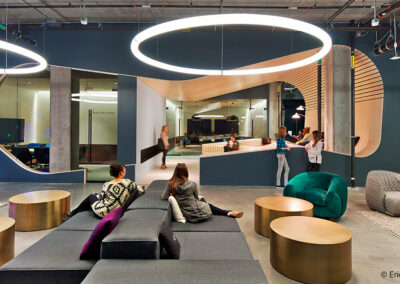 Dropbox a mis un point d’honneur à concevoir des espaces qui favorisent le bien-être. Le bâtiment est doté de zones de détente, d’espaces dédiés à la méditation, de salles de sport, et d’une cafétéria proposant des repas équilibrés. Chaque étage est aménagé pour offrir aux employés des environnements adaptés à des moments de repos, de concentration, ou de collaboration active.