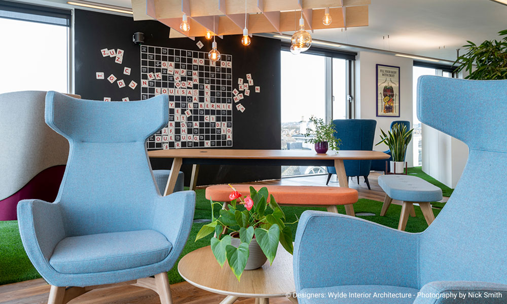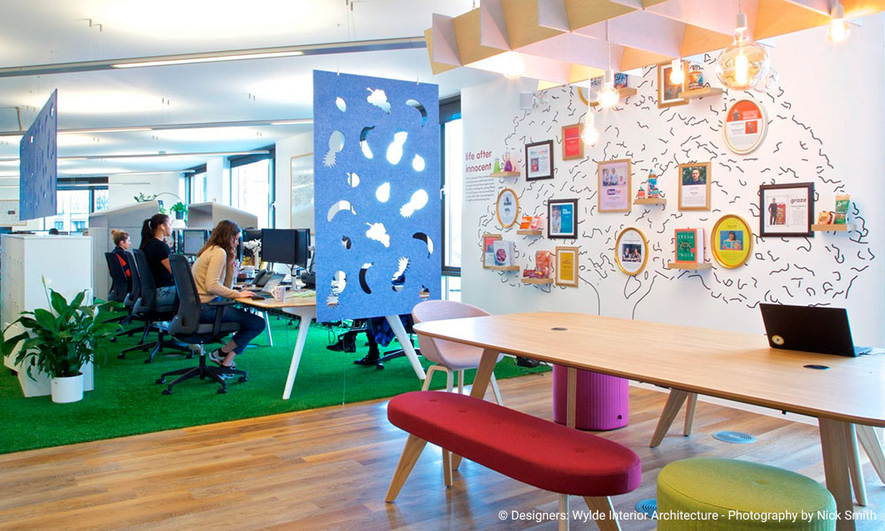 Le siège d’Innocent Drinks, surnommé « Fruit Towers », est un lieu de travail où la créativité et le fun sont omniprésents. Le design intérieur utilise des couleurs vives, des éléments décoratifs ludiques et une atmosphère conviviale. Les bureaux sont ouverts, favorisant la collaboration, avec des espaces de détente intégrés dans le design, comme des hamacs, des fauteuils confortables et des coins café pour favoriser la relaxation et les échanges informels.