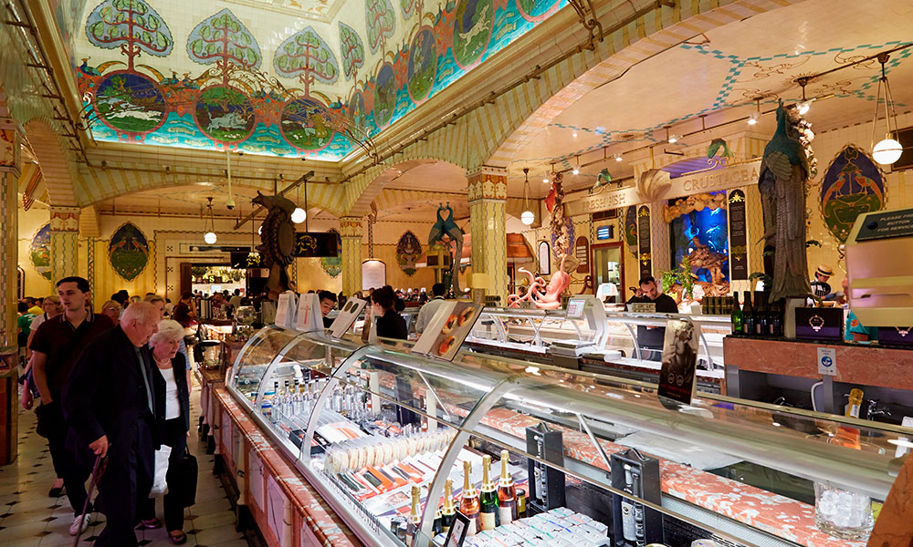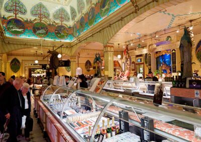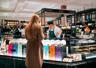 L’intérieur de Harrods est un hommage au luxe intemporel, avec des espaces décorés de manière unique, chacun évoquant une atmosphère particulière. Le Food Hall, par exemple, avec ses mosaïques, ses plafonds richement sculptés et ses lustres en cristal, donne l’impression de se trouver dans un palais dédié à la gastronomie. Cette conception soigneusement orchestrée encourage les clients à explorer chaque espace, transformant la visite en une expérience immersive, où l’achat devient une suite naturelle.