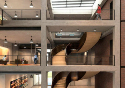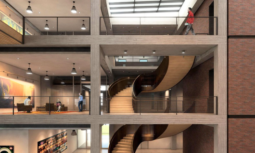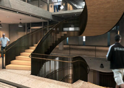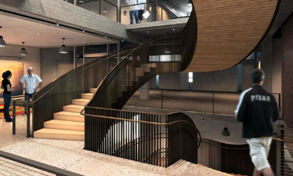 L’un des aspects les plus remarquables du campus de Pixar est son architecture pensée pour favoriser la collaboration. Le bâtiment principal, appelé « The Steve Jobs Building », est conçu comme un vaste espace ouvert, avec des zones de travail interconnectées. L’idée derrière ce design est d’encourager les interactions spontanées entre les employés, créant ainsi un environnement où les idées peuvent émerger de manière fluide.